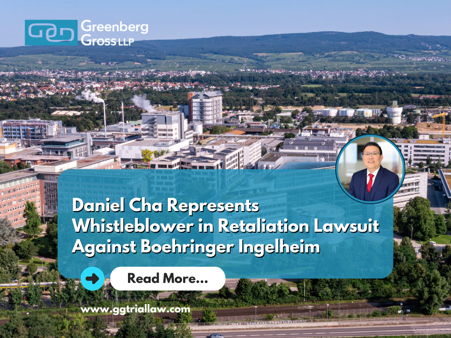 Daniel Cha, a partner at Greenberg Gross LLP, represents a longtime pharmaceutical employee who filed a whistleblower retaliation lawsuit against Boehringer Ingelheim after raising safety and regulatory compliance concerns related to a biosimilar drug.
